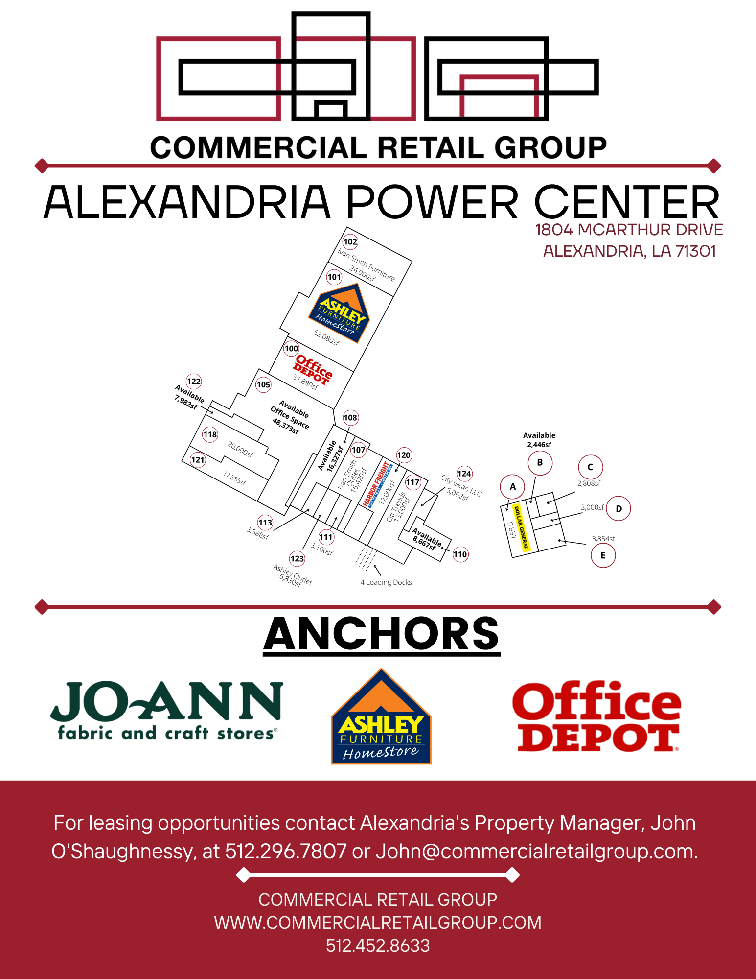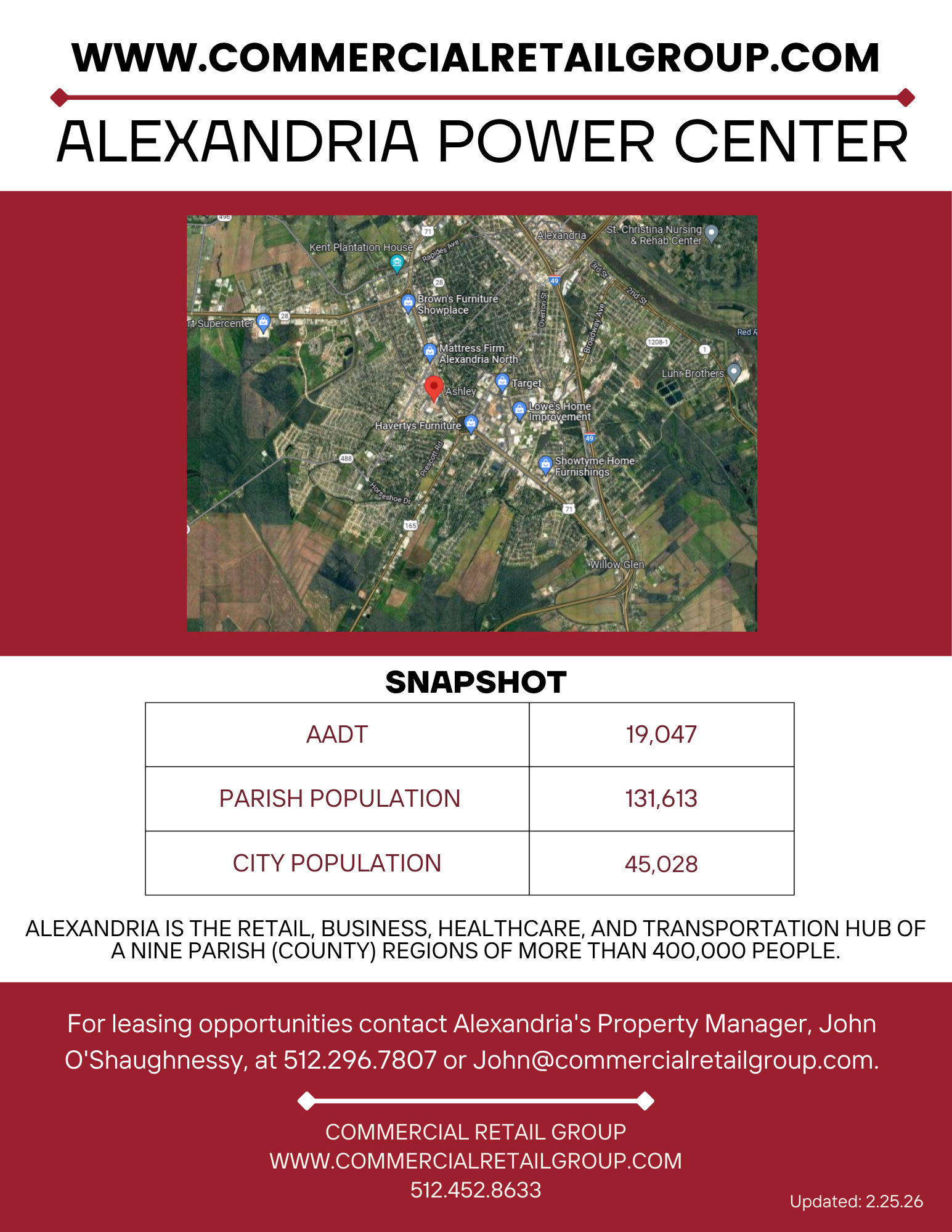 For more information on Alexandria Power Center email John O'Shaughnessy, Property Manager at John@commercialretailgroup.com or 512-296-7807!