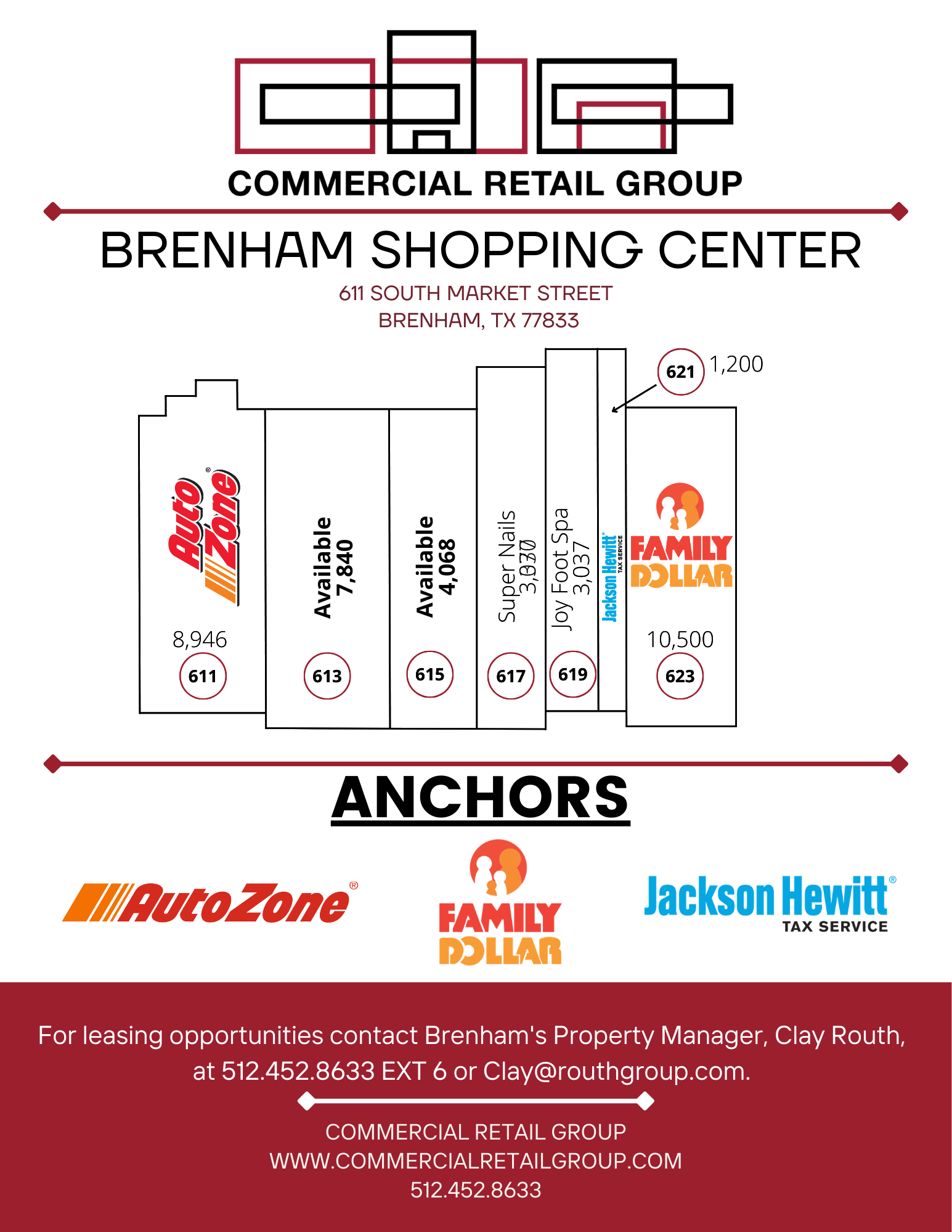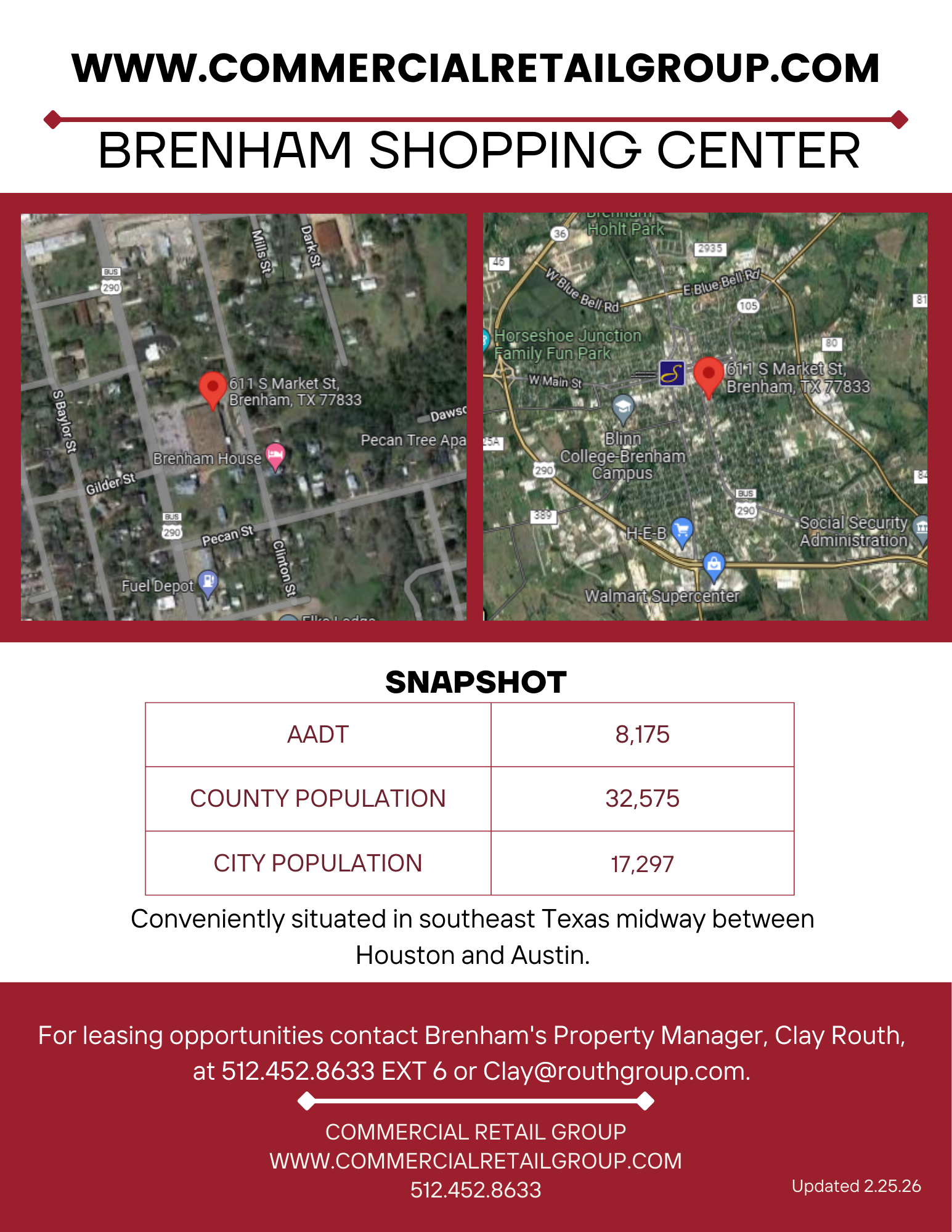 For more information on Brenham Shopping Center email Clay Routh, Property Manager at Clay@Routhgroup.com or 512-452-8633 Ext 6!